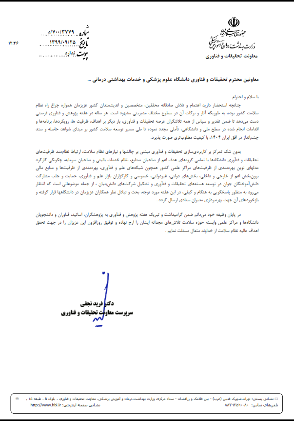 متن پیام تبریک سرپرست معاونت تحقیقات و فناوری وزارت بهداشت: