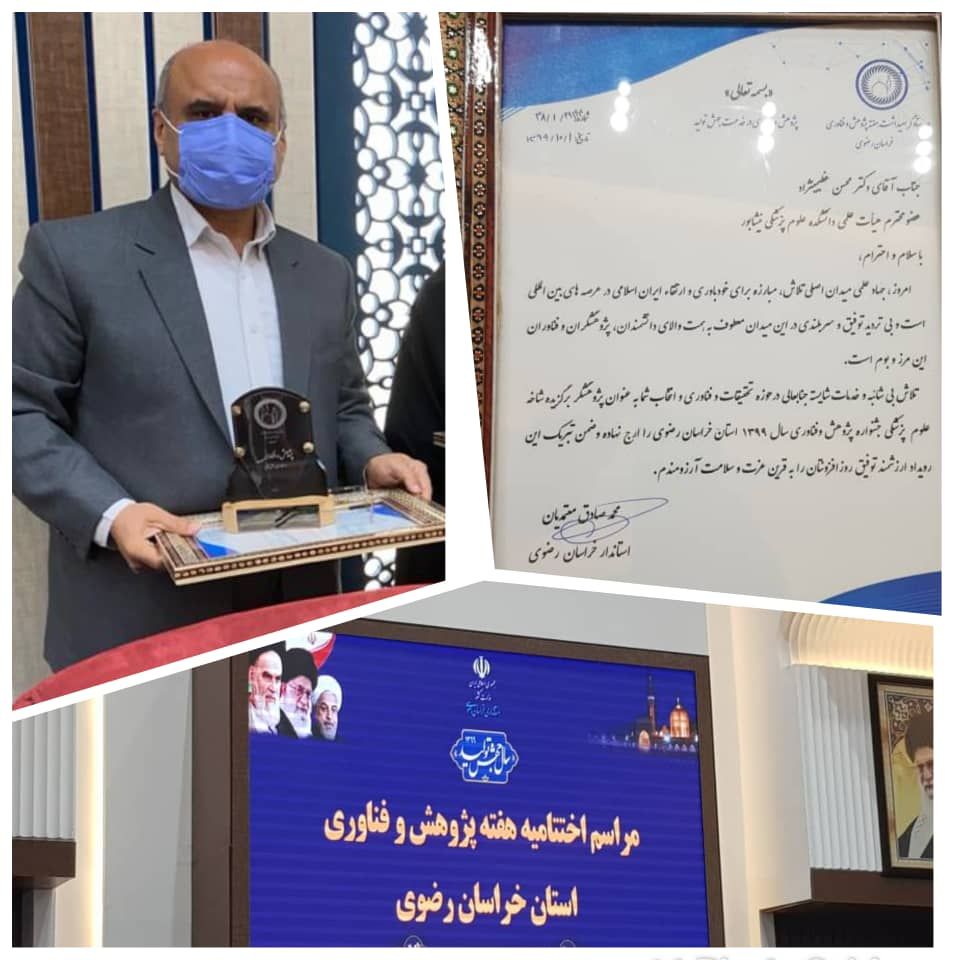 ایشان ضمن تبریک به دکتر محسن عظیمی نژاد عضو هیئت علمی دانشکده علوم پزشکی نیشابور به عنوان پژوهشگر برتر استان بیان داشتند: از بين پژوهشگران برتر دانشكده دو نفر براي سطح استان معرفي شدند كه در نهايت يكنفر، بعنوان پژوهشگر برتر در استان برگزيده شد، در این مراسم 9نفر از پژوهشگران برتر استان تجلیل شدند که باعث افتخار است دکتر عظیمی نژاد، عضو هیات علمی دانشکده جزو این فهرست میباشد.