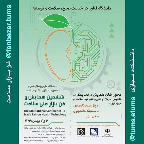 ششمین همایش و فن بازار ملی سلامت با شعار: دانشگاه فناور در خدمت صلح، سلامت و توسعه، 6 و 7 بهمن 1399 به میزبانی دانشگاه علوم پزشکی تهران و در بستر آنلاین دانشکده مجازی برگزار می شود.