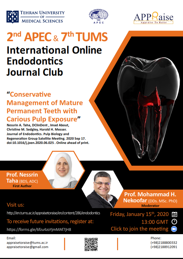 دومین جلسه ژورنال کلاب آنلاین APEC با بررسی مقاله چالشی با عنوان: Conservative Management of Mature Permanent Teeth with Carious Pulp Exposure" با همکاری