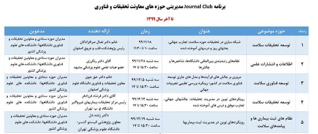 با توجه به اهمیت آشنایی و آگاهی مدیران و پژوهشگران با مهمترین و جدیدترین روشهای ملی و بین المللی مدیریت کارآمد تحقیقات در نظام سلامت، معاونت تحقیقات و فناوری وزارت بهداشت درمان و آموزش پزشکی اقدام به برگزاری جلسات آموزش مدیریت پژوهش (در قالب ارایه تجارب، ژورنال کلاب، میز گرد و ...) جهت معاونین، مدیران، کارشناسان و پژوهشگران دانشگاه های علوم پزشکی کشور نموده است. این جلسات مطابق اطلاعیه های پیوست روزهای سه شنبه هر هفته، از ساعت ۱۵:۳۰ تا ۱۷ در آدرس اینترنتی  https://vc.behdasht.gov.ir/jc برگزار می شود.