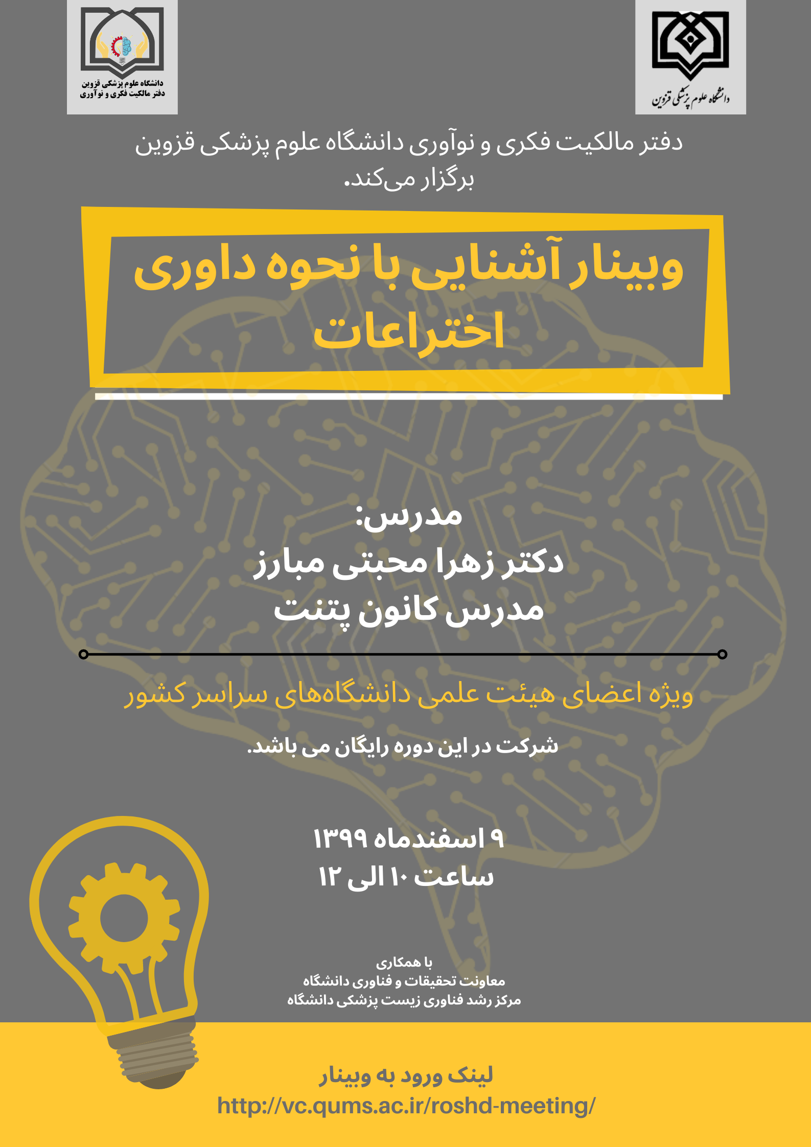 به اطلاع می رساند، دوره آموزشی آنلاین آشنایی با نحوه داوری اختراعات، توسط مرکز رشد فناوری زیست پزشکی دانشگاه علوم پزشکی قزوین در تاریخ 9 اسفند ماه 99 از ساعت 10 الی 12 ویژه اعضای محترم هیأت علمی،برگزار میگردد.