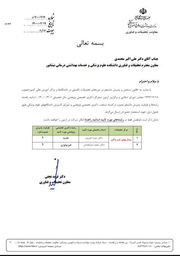 دکتر محمدی ضمن ابراز خرسندی در خصوص مجوز کسب شده ، بیان داشت:  مرکز تحقیقات بیماریهای غیر واگیر دانشکده علوم پزشکی نیشابور با مجوز وزارت بهداشت درمان و آموزش پزشکی و در راستای تربیت نیروی انسانی متخصص در نظر دارد پس از قبولی در آزمون متمرکز دکتری تخصصی پژوهشی وزارت بهداشت در سال تحصیلی 1401-1400، نسبت به  جذب و پذیرش دو نفر دانشجوی دکتری تخصصی پژوهش محور در رشته های تغذیه و فیزیولوژی ( هر کدام یک نفر) در مرکز تحقیقات بیماریهای غیر واگیر اقدام نماید.
