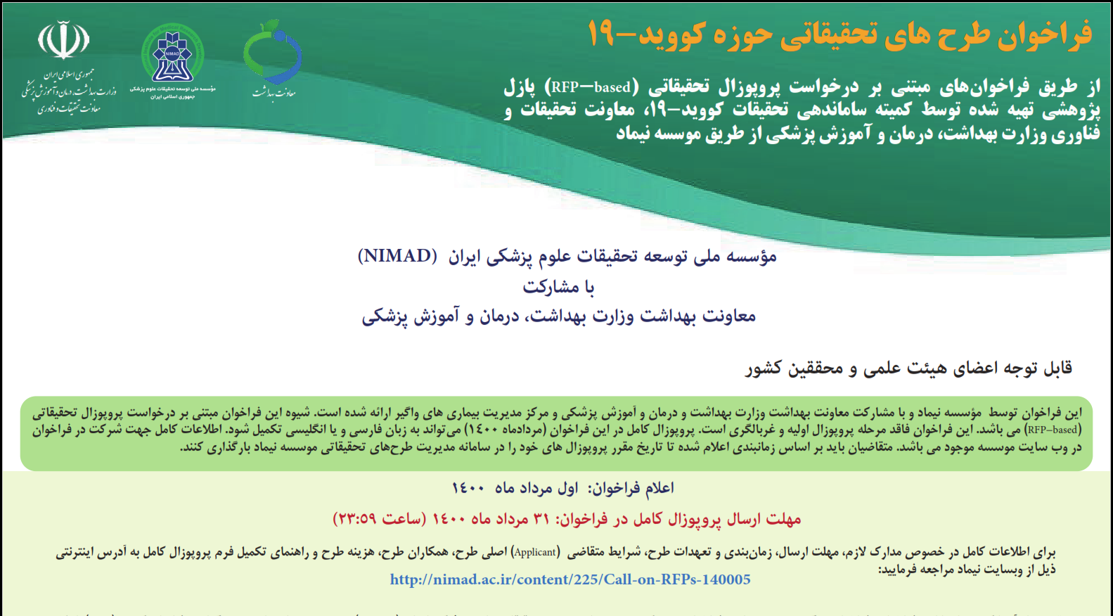 مهلت فراخوان: اول مردادماه لغایت ۳۱ مردادماه ۱۴۰۰ (این مهلت تمدید نخواهد شد)