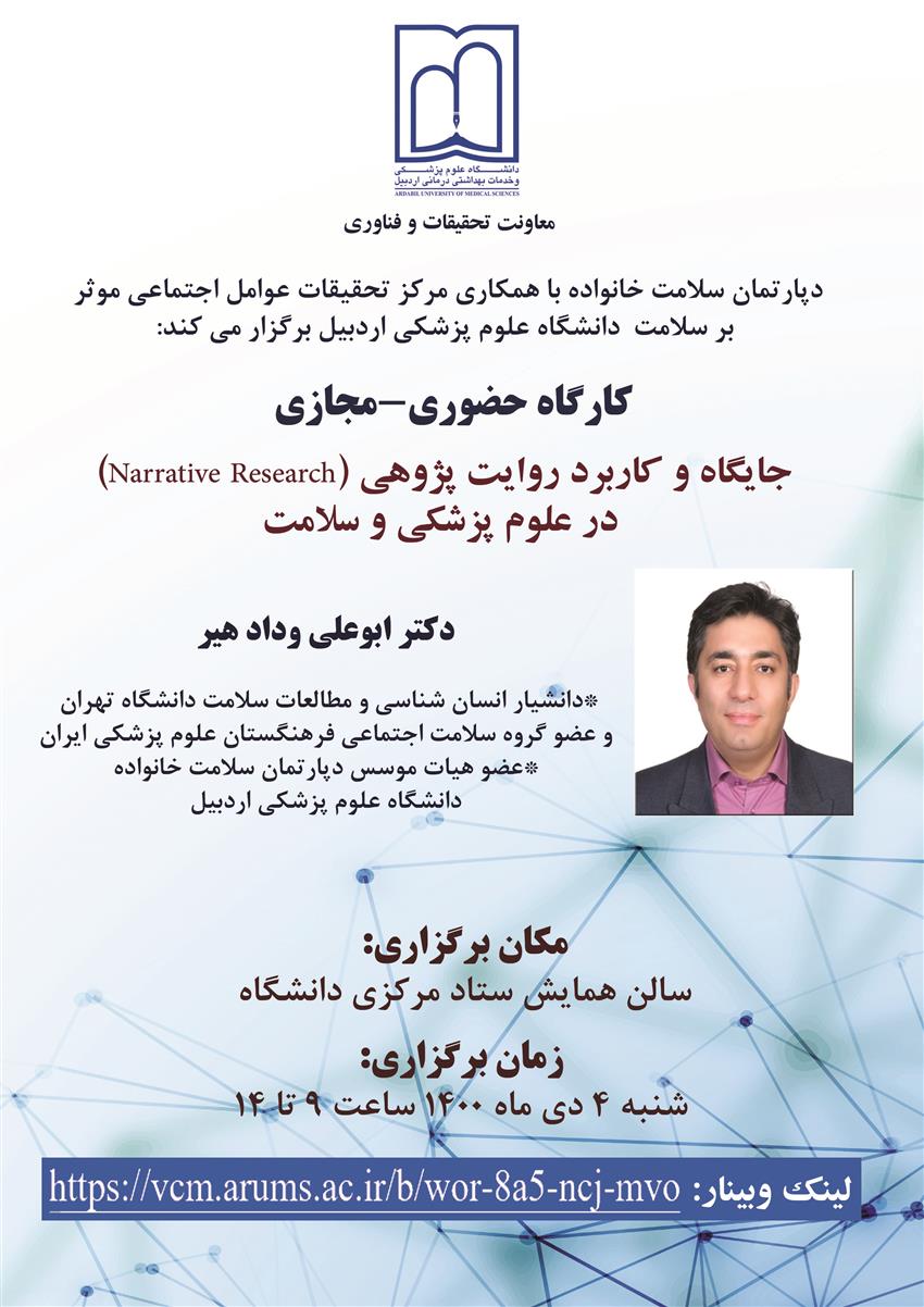 "جايگاه و كاربرد روايت پژوهي (Narrative Research) در علوم پزشكي و سلامت"با حضور "دكتر ابوعلي ودادهير" دانشيار انسان شناسی و مطالعات سلامت دانشگاه تهران و عضو گروه سلامت اجتماعی فرهنگستان علوم پزشكی ايران و عضو هيات موسس دپارتمان سلامت خانواده دانشگاه علوم پزشكی اردبيل، توسط دپارتمان سلامت خانواده و مركز تحقيقات عوامل اجتماعی موثر بر سلامت معاونت تحقيقات و اردبيل پزشكی علوم دانشگاه فناوري در روز شنبه تاريخ 04/10/1400، ساعت 9 الي 14 برگزار میگردد.علاقه مندان می توانند جهت شركت مجازي در اين برنامه در تاريخ مذكور از لينك زير وارد جلسه گردند: