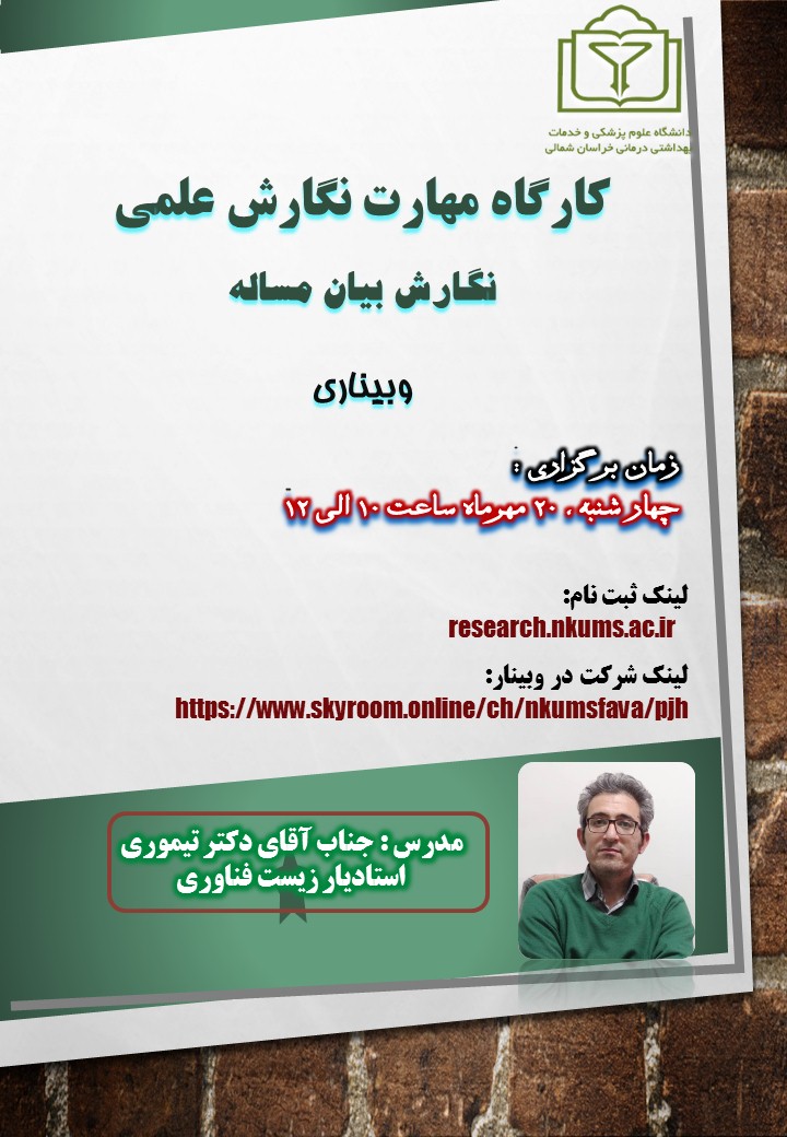 احتراماً بدینوسیله به اطلاع می رساند کارگاه آموزشی" مهارت نگارش علمي - نگارش بيان مساله" بصورت وبیناری، در تاریخ 20 مهرماه 1401 ساعت 10 الی 12 ویژه اعضای هیات علمی، پژوهشگران و دانشجویان تحصیلات تکمیلی توسط معاونت تحقیقات و فناوری دانشگاه علوم پزشکی خراسان شمالی با تدریس جناب آقاي دكتر منوچهر تيموري دكتراي بيوتكنولوژي دارويي برگزار خواهد شد. از علاقمندان دعوت می شود از طریق لینك  /https://research.nkums.ac.ir در کارگاه مذکور ثبت نام نمایند.