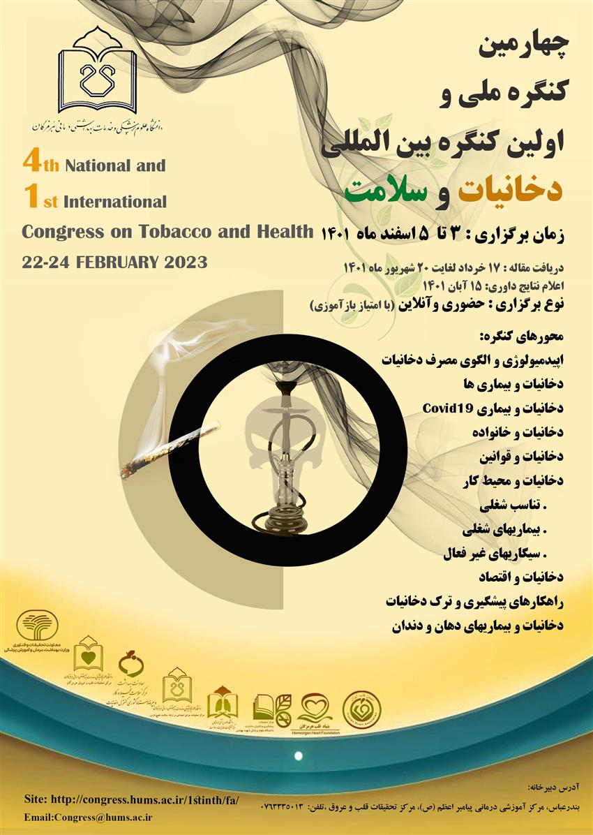 چهارمین کنگره ملی و اولین کنگره بین المللی دخانیات و سلامت (با امتیاز بازآموزی)،در تاریخ ۳ تا ۵ اسفند ۱۴۰۱ توسط دانشگاه علوم پزشکی هرمزگان ، مرکز تحقیقات قلب و عروق خلیج فارس حضوری و آنلاین برگزار می گردد.