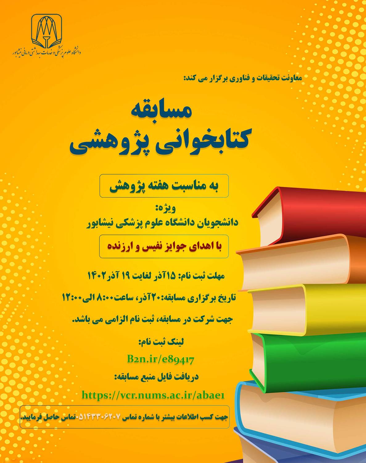 معاونت تحقیقات و فناوری دانشگاه علوم پزشکی نیشابور، به مناسبت هفته پژوهش در نظر دارد مسابقه کتابخوانی پژوهشی، ویژه دانشجویان دانشگاه علوم پزشکی نیشابور را با اهدای جوایز نفیس و ارزنده برگزار کند.از علاقه مندان به شرکت در این مسابقه دعوت می گردد جهت ثبت نام به لینک B2n.ir/e89417 مراجعه نمایید.